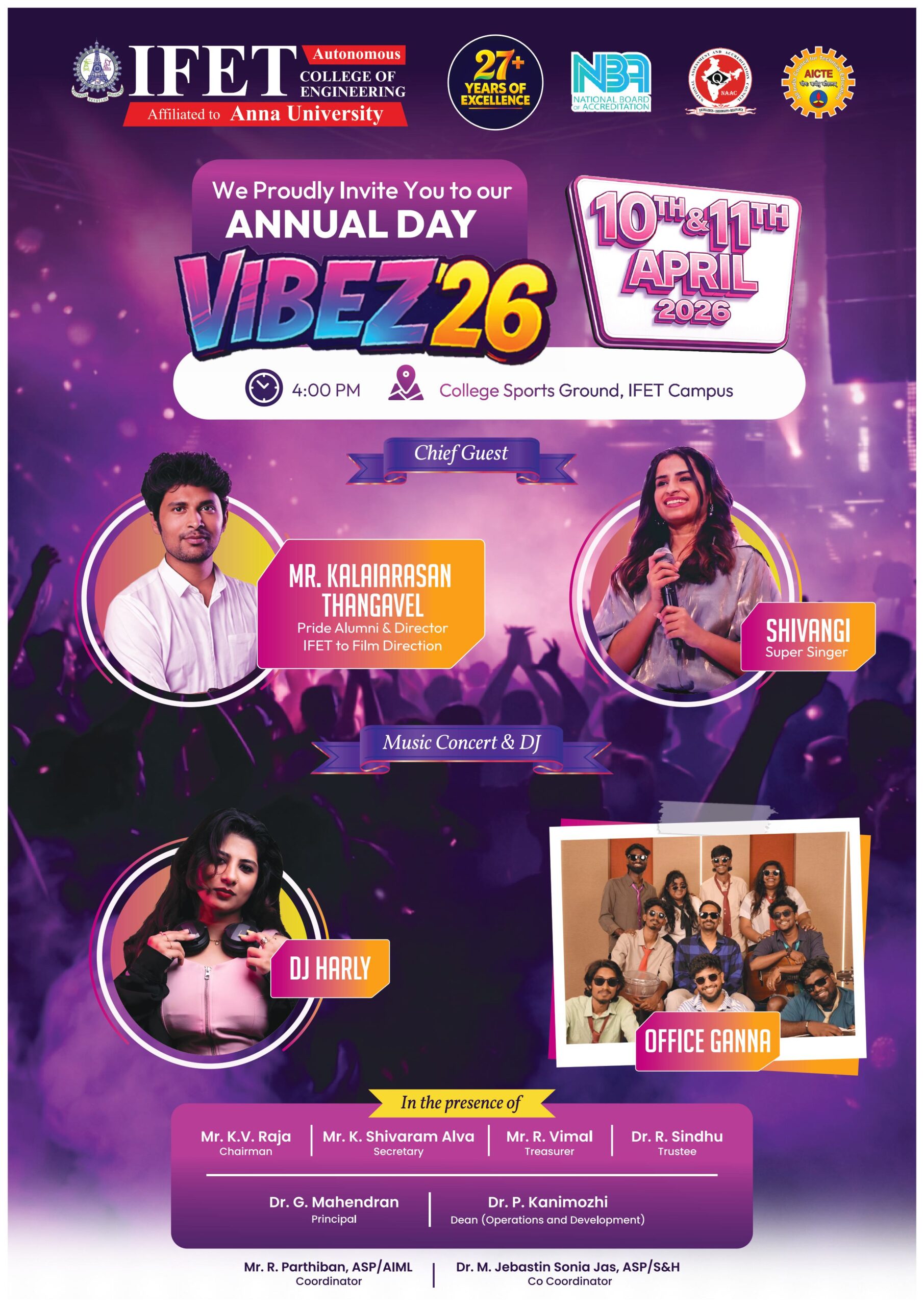 Annual Day “Vibez’26” will be celebrated on 10th and 11th April 2026, showcasing cultural talent, creativity, and vibrant student performances.